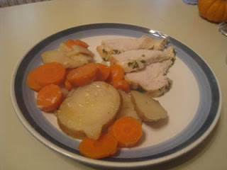 Place the breast, skin side up, on the vegetables. Drizzle with the remaining lemon juice on top. Cover and cook on high until the breast is cooked throughly and the vegetables are tender when pierced (3-4 hours).