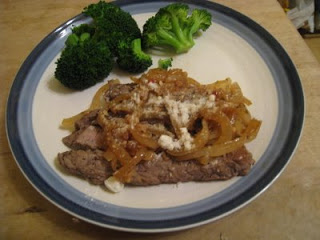 Top steak with onion mixture, sprinkle with cheese and ENJOY!