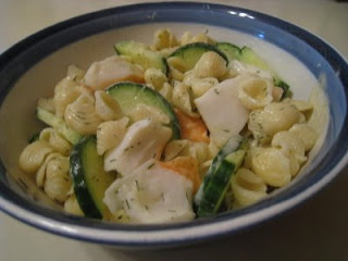 Transfer pasta mixture to a bowl; toss with cucumber and dill. In another bowl, whisk together mayonnaise, oil, lemon juice and dijon; season with salt and pepper.