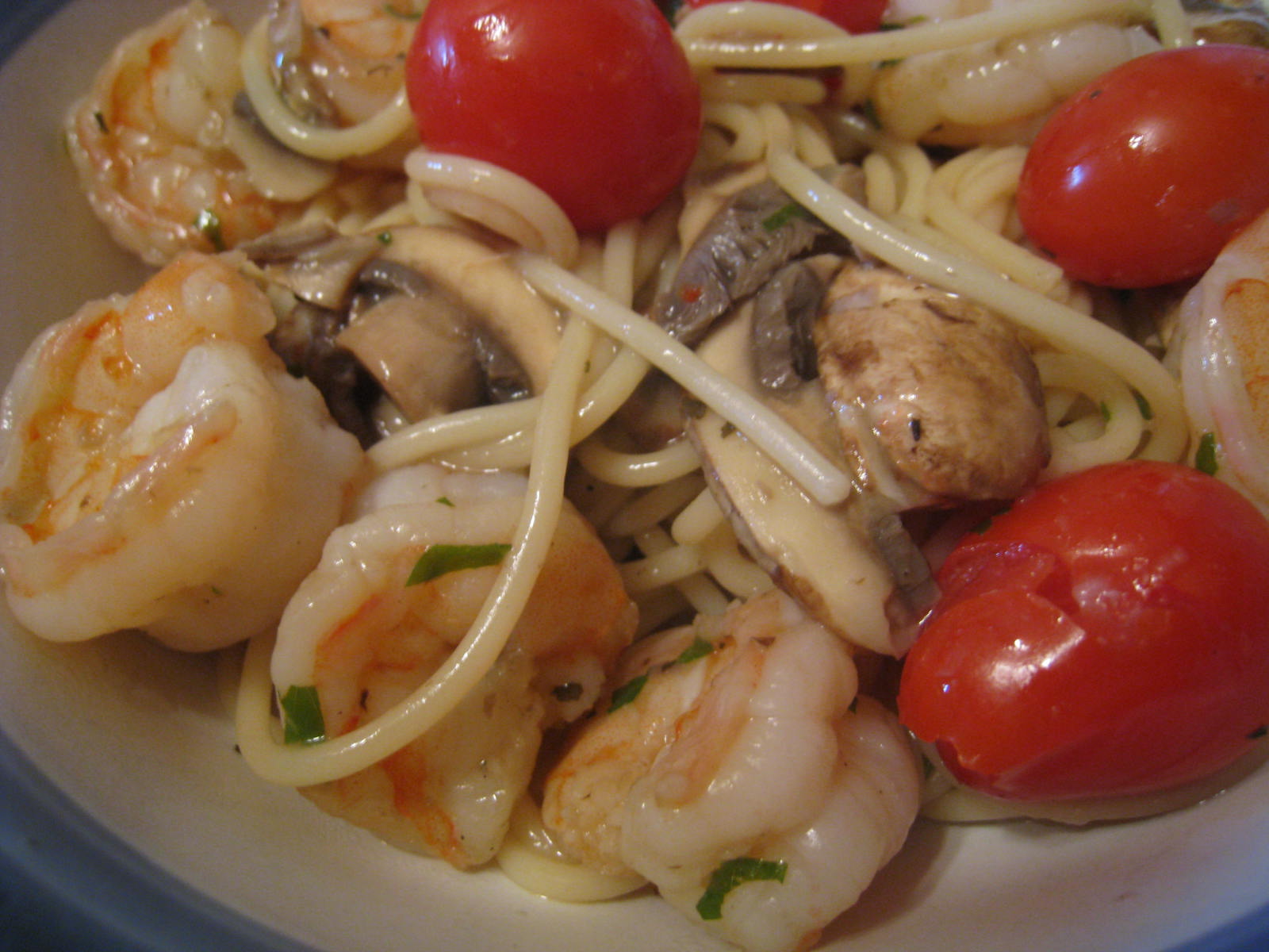 Cook pasta according to package. In a large skillet, heat 1/2 cup of dressing over medium heat. Stir in mushrooms, cooking 5 minutes until mushrooms start to cook. Add the shrimp and parsley. Cook 2 minutes or until shrimp are pink and mushrooms are tender. Toss in a handful of cherry tomatoes to warm through.