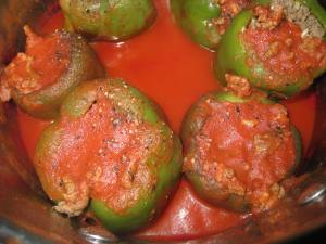 Cook beef over medium heat in a sauce pan and drain grease. Add a handful of instant rice and stir to combine. Add the amount of rice you’d like in your peppers. Clean and stuff peppers with beef mixture. Prick bottoms of peppers to allow juices to rise into the peppers