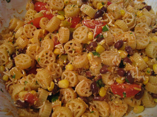 In a large bowl, combine black beans, corn, tomatoes, salsa and cheese. Add the cooled pasta and mix well.