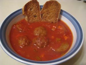 Add garlic and seasoning. Mix well. Stir in tomatoes and broth, bring to a simmer. Cut meatballs in half and add to soup. Simmer an additional 10 to 12 minutes; season to taste with salt and pepper.