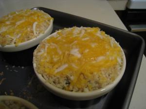 Divide mixture among four 10-oz ramekins or custard cups. In a small bowl, combine panko and melted butter; sprinkle over scallop mixture. Bake uncovered at 350 degrees for 15-20 minutes or until bubbly. Sprinkle with cheese, bake 5 minutes longer or until cheese is melted.