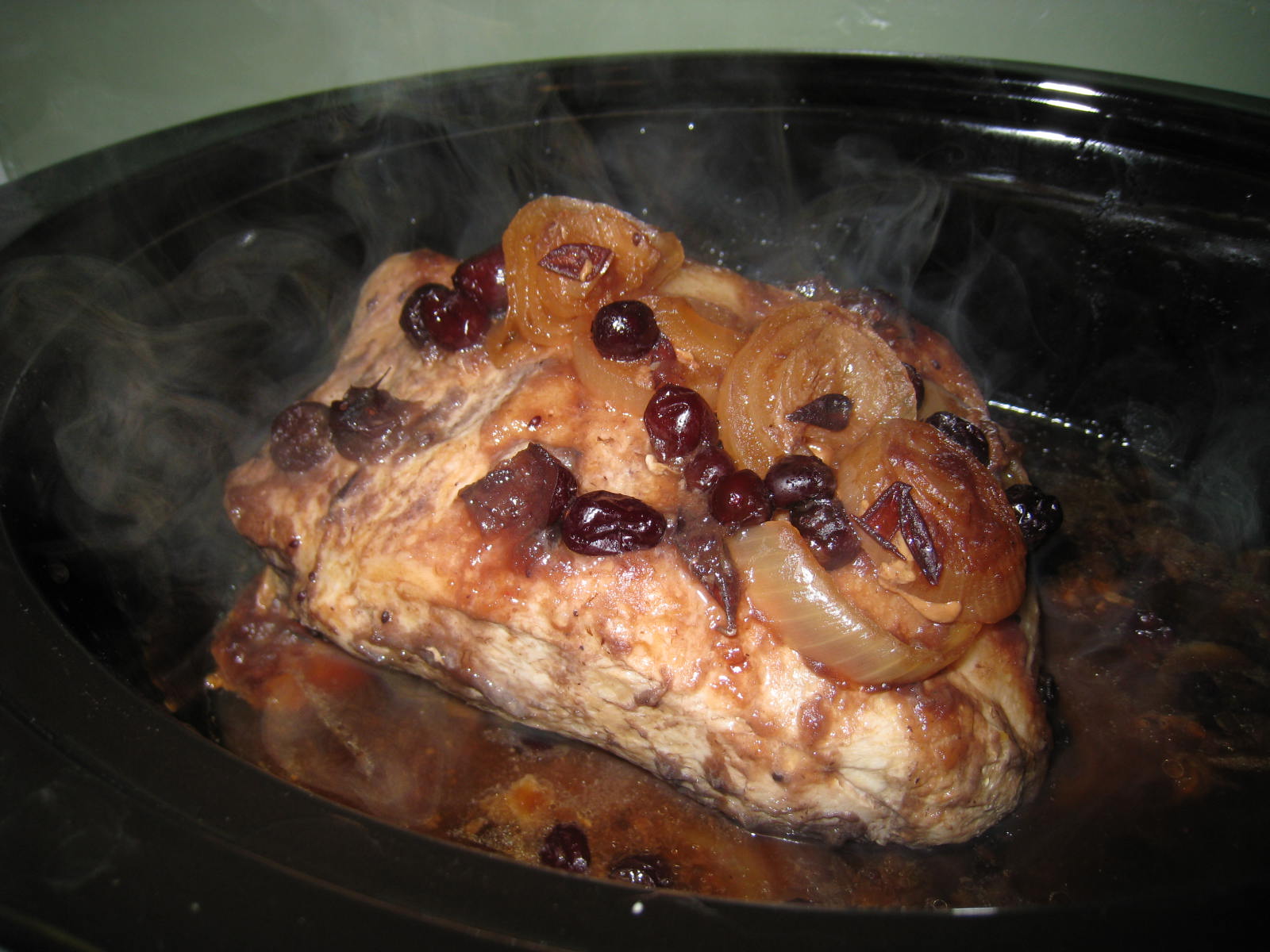 In a medium bowl, combine the cranberry sauce, dressing and onions. Mix well. In a slow cooker, add the pork. Season with salt and pepper. Pour the dressing over the pork and cook on low for 6 to 8 hours. Enjoy!