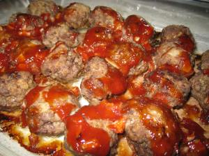 Combine all sauce ingredients. Pour over meatballs and bake at 350 degrees for 45 minutes.