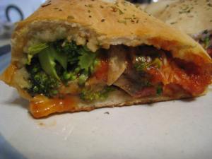 Steam broccoli for 2 minutes to partially cook. Drain to remove any water from the steaming process. Dividing evenly, scatter the broccoli over dough, leaving a 1/2 inch boarder. Sprinkle with garlic and season with salt and pepper. Divide the mozzarella, salami and pizza sauce evenly over the 4 strombolis.