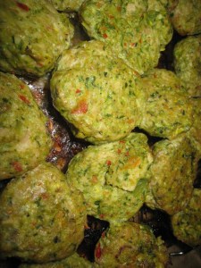 Form meatballs into golf shape sizes and place them on a greased baking sheet. Bake for 30 minutes, flip and then bake for another 20 minutes.