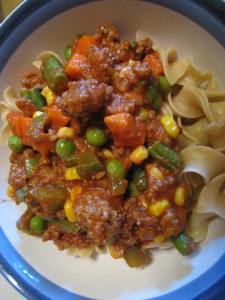 Nutritional facts: 1 ¼ cup beef mixture over ¾ cup cooked noodles. 389 calories, 9 g fat (3g sat fat), 56 mg cholesterol, 800 mg sodium (my version is less since the original recipe called for full salt tomato sauce), 49g carb, 10g fiber, 31g protein