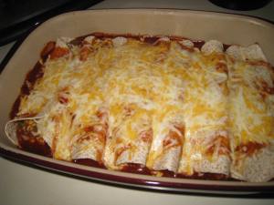 Spread 1/4 cup of the enchilada sauce in a 13×9 baking dish. Brush one side of the tortilla with the enchilada sauce. Spoon 1/4 cup of the bean mixture into the center of the sauced side; roll up tortilla. Place rolled enchilada in a baking dish. Repeat with remaining tortillas and bean mixture.