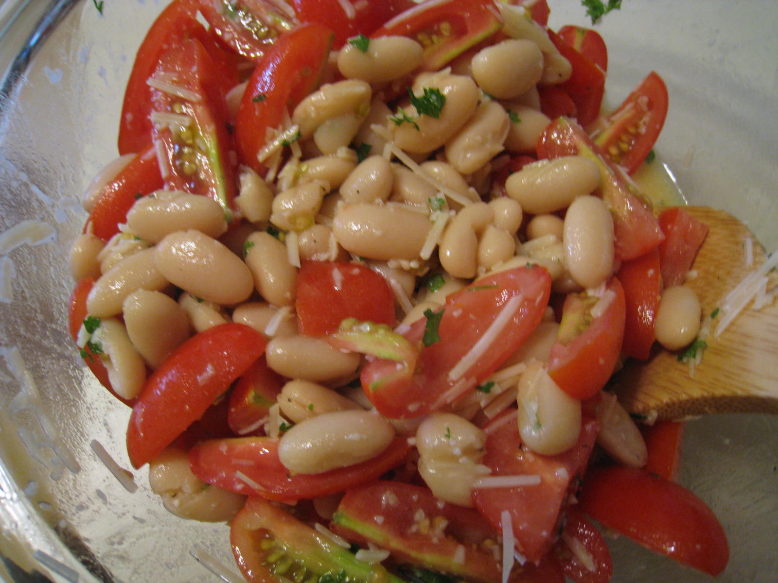 In a medium bowl, mix dressing and beans together. Add the cherry tomatoes and parmesan cheese. Gently mix together. Refrigerate to chill salad.