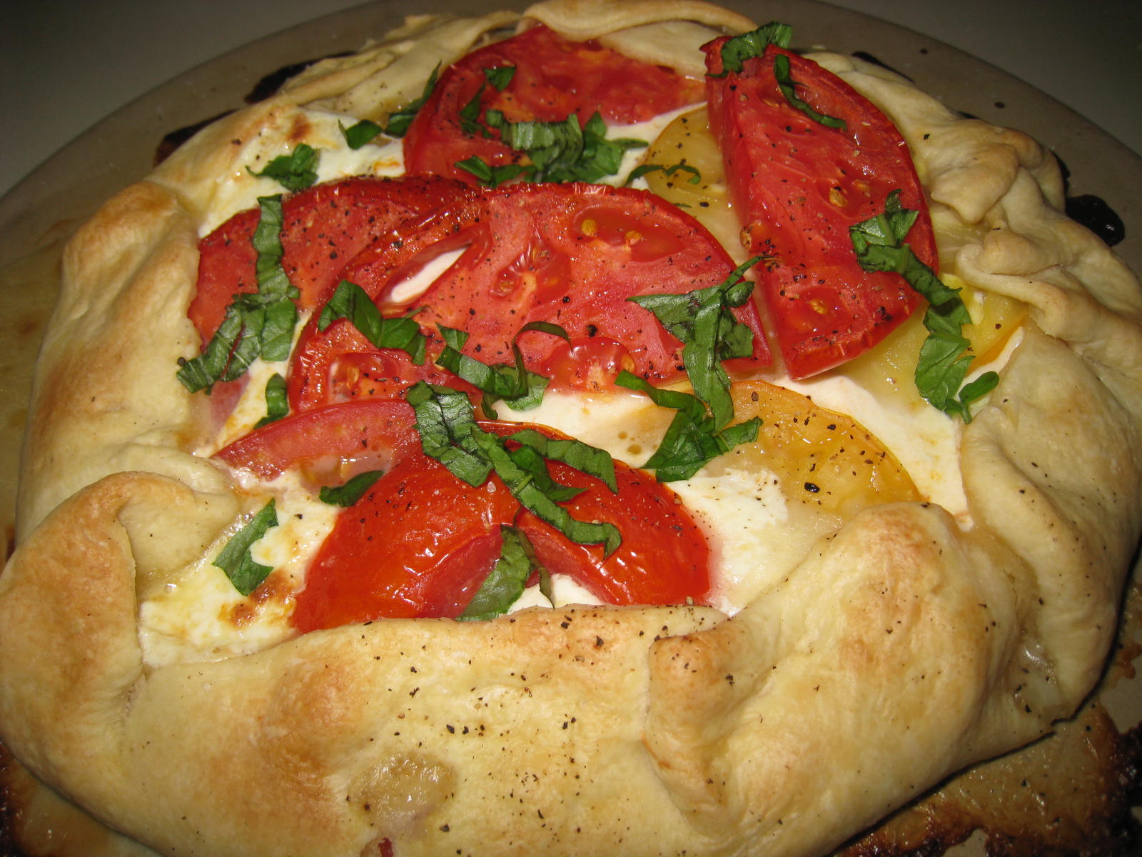 Fold up the pie crust over top of the tomatoes and cheese. Pinch crust together in pleats to hold everything together. Brush with olive oil and season with salt and pepper.