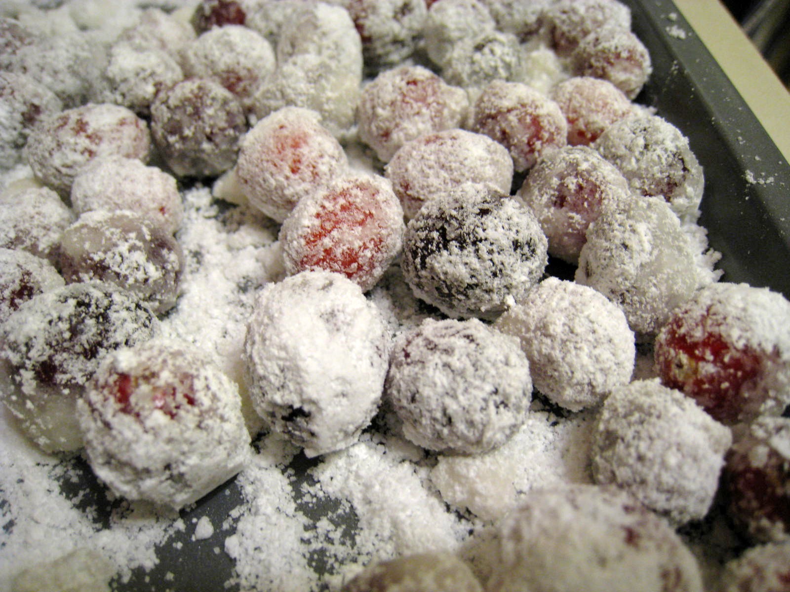 Sprinkle both sugars on a cookie sheet and mix well. Using a slotted spoon, transfer the wet cranberries to the sugar mixture. Stir until all the cranberries are coated and leave in the sugar mixture for 30 minutes or until sugar coating hardens.