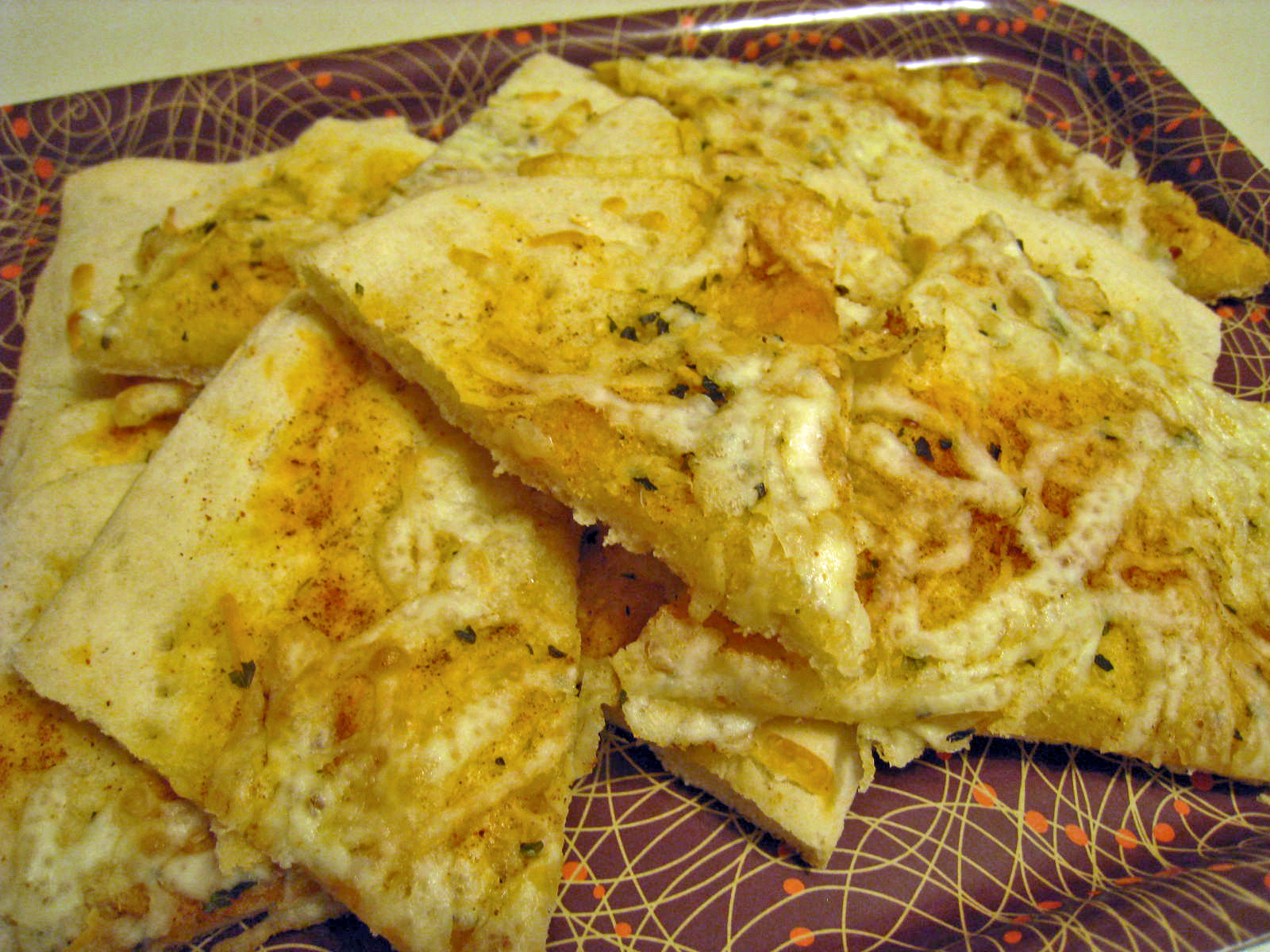 Spread out pizza dough in a greased jelly roll. Poke holes into the dough with a fork. Spread the melted butter over the dough. Sprinkle seasonings and cheese evenly over dough.