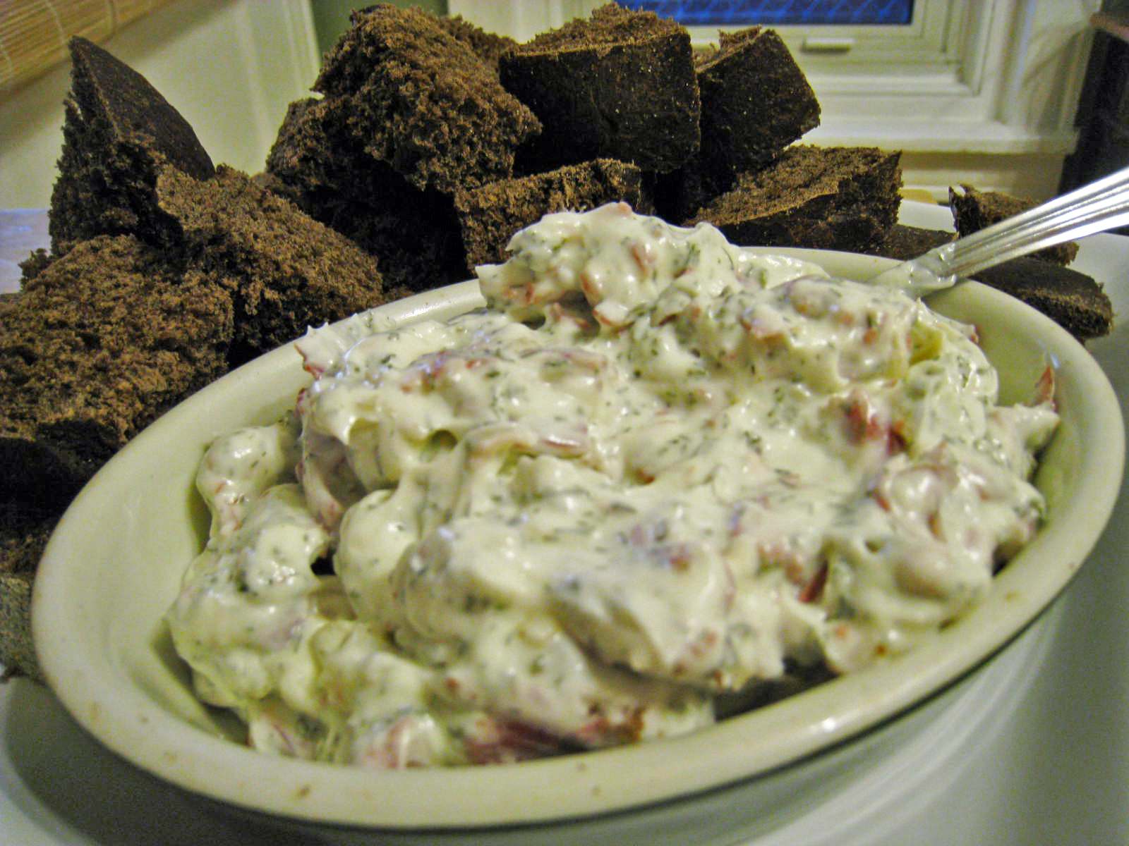 This is probably one of my favorite dips to make and I know it’s my husband’s favorite dip to eat! It makes a lot of dip and it’s best after sitting for at least 24 hours. The flavors really blend together and it’s delicious with pumpernickle bread.