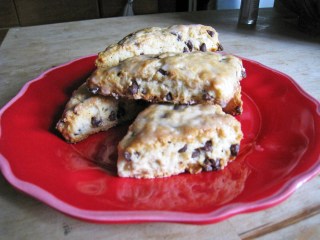 Line a large baking sheet or two smaller baking sheets with parchment paper and set aside. In a large bowl, whisk together the flour, sugar, baking powder and salt. With a pantry cutter, cut the butter into the flour mixture until it is coarse texture and resembles sand. Add the chocolate chips and stir to distribute.