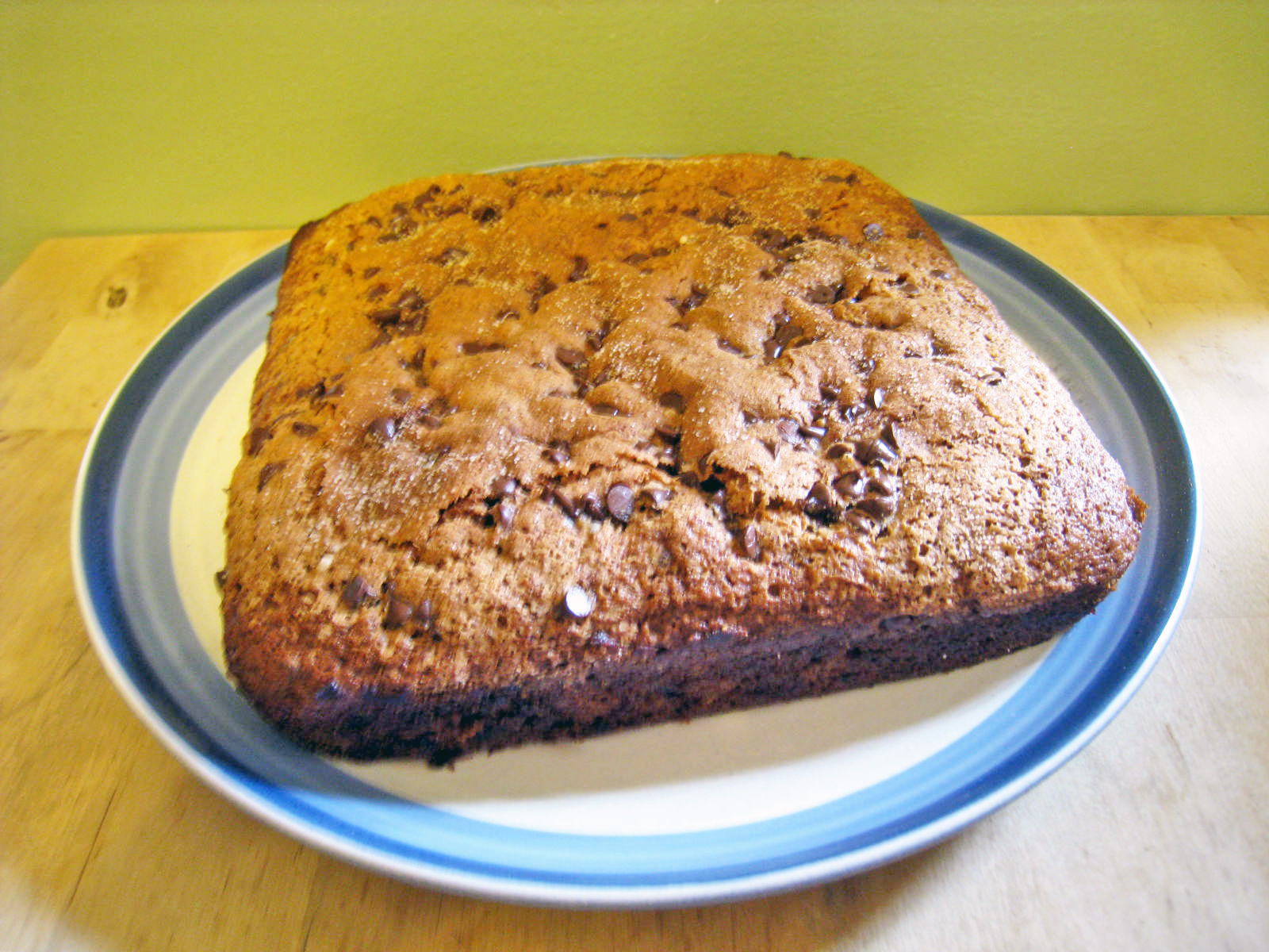 Once again I found myself with a bunch of very ripe bananas. I hate when they go from green to brown in couple of days. That’s what happened with this bunch, but I knew I’d find something to make with them – no more waste in this house! The recipe originally called for cinnamon chips, but since I didn’t have those and have been craving chocolate, it was a simple substitute!