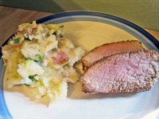 Remove the pan from the heat and mash the potatoes to a chunky texture with a potato masher or a wooden spoon (my method – I really do need to invest in a potato masher!). Set aside and keep warm.