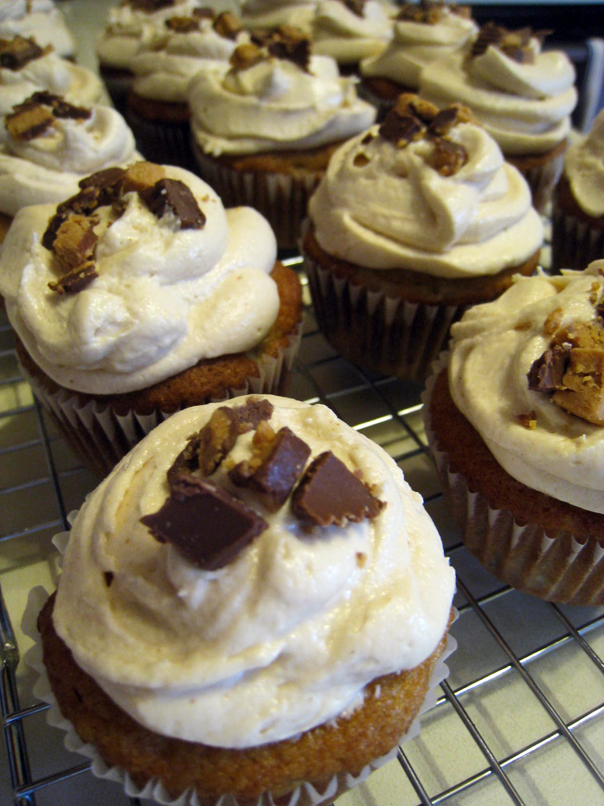 Frost the cupcakes with the frosting and garnish with crushed peanut butter cups.