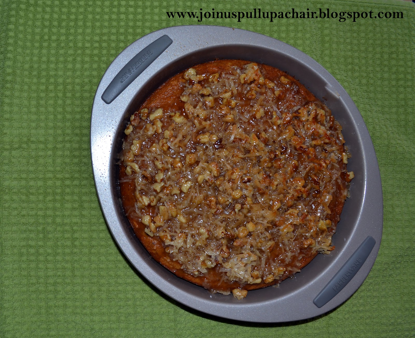 With 5 minutes left in baking, start the topping. Melt the butter in a small saucepan. Add the brown sugar, nuts and coconut and bring to a boil. Cover both cakes with the topping and return the cake to the oven under the broiler for 1 minute. Be careful and watch the cake to make sure the topping does not burn.