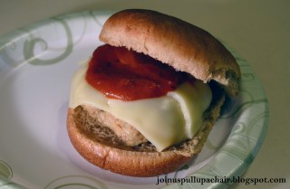 Top with mozzarella cheese and warmed pizza sauce. We served them on whole wheat rolls or you could eat them without (which I did the next day for lunch).