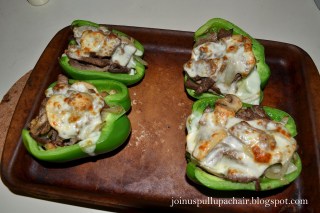 Preheat oven to 400 degrees. Line each pepper with a 1/2 slice of provolone. Fill each pepper with the meat mixture until they are full. Top each pepper with the remaining 1/2 slice of provolone.