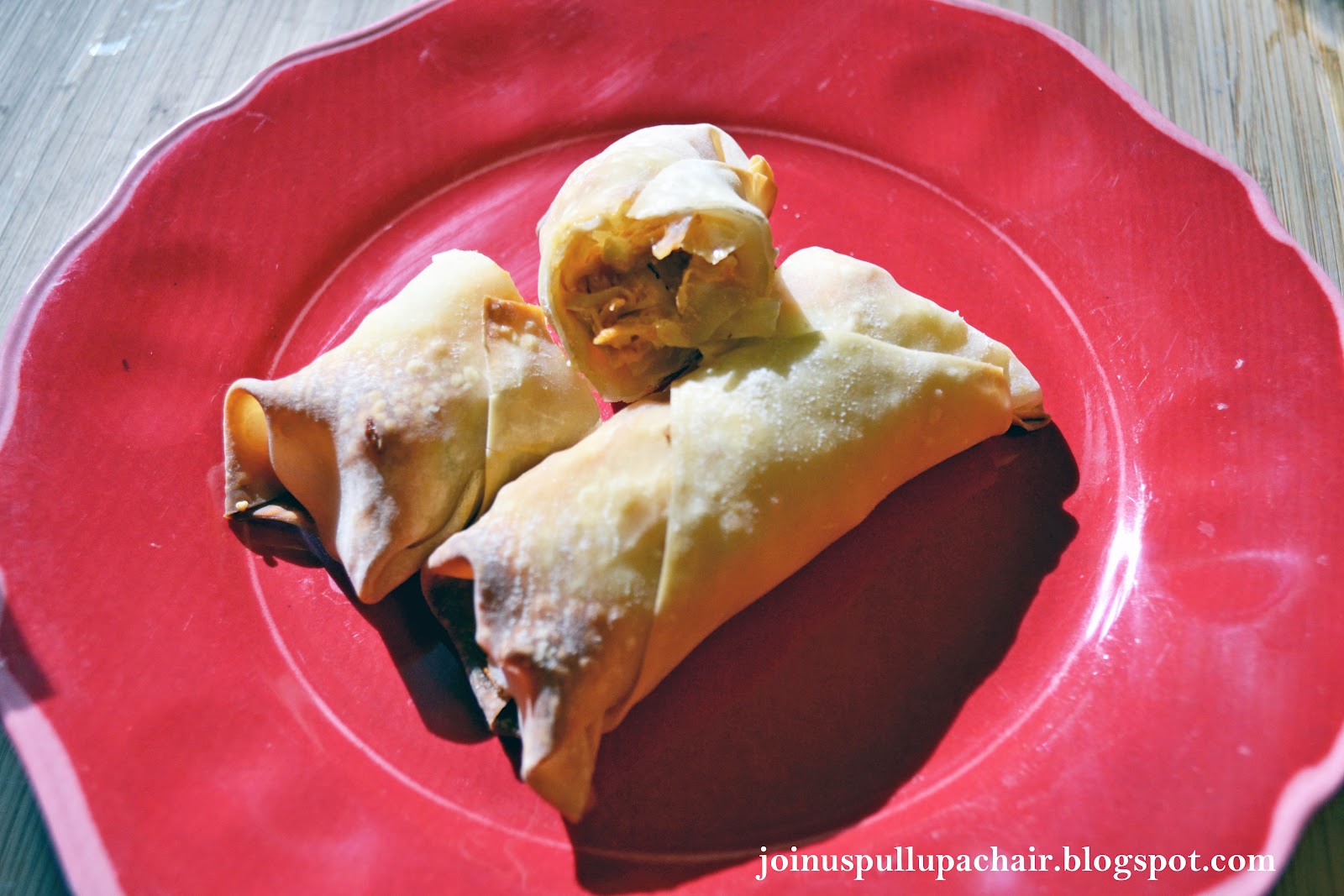 Fold the bottom right corner over the stuffing so it covers it completely. Fold in the bottom left corner, then the right corner…it should like an envelope. Roll the wrap upward one time, leaving the top left corner open. Wet a finger in the bowl of water and moisten the corner of the wrapper. Fold down the wrapper and seal it with the roll. Continue this process until all the chicken is used.