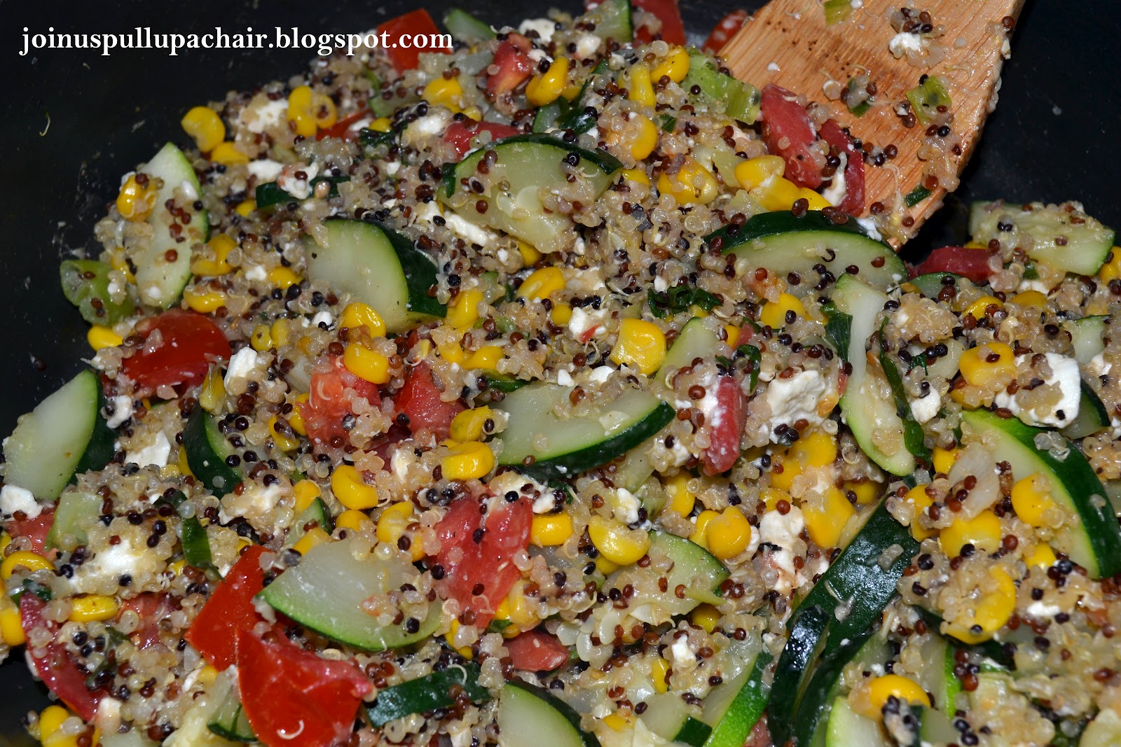 If you want to make this a cold salad, do not combine the quinoa into the skillet. Let all ingredients cool separately and then combine the cooked quinoa, cooked vegetables, tomatoes, feta, basil and vingairette into a large bowl. Chill until you’re ready to serve.
