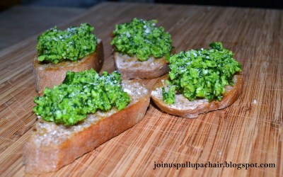 I received a big bag of arugula in our last CSA share and besides putting it into salads, I never know what to do with it. But now, I have a new favorite recipe – actually all three of us enjoyed it. I didn’t think my daughter would eat it because of the peppery taste of arugula, but she gobbled down a couple pieces of crostini and asked for more. Success! This would be a great recipe to use for an appetizer for a holiday party. I love how green the mixture is and it tastes so fresh.