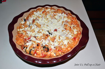 Pour the tomato olive mixture over the pasta and stir to toss. Pour the cheese sauce over the pasta and toss to coat. Pour the pasta and sauce into the prepared baking dish. Sprinkle the top of the pasta with the remaining 4 oz of feta.