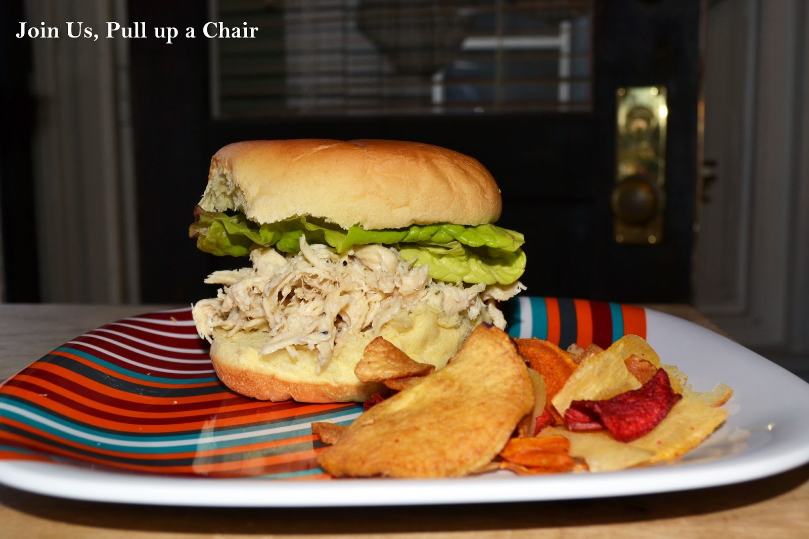 Add the dressing, cheese, parsley and season with salt and pepper. Warm the chicken on low for 30 minutes. Serve on rolls with a leaf of Romaine lettuce.