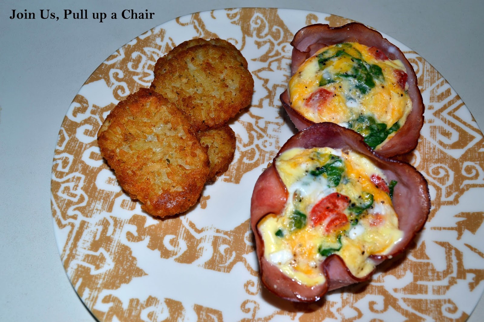 Line each baking cup with a piece of ham. Divide the egg mixture between each cup. Bake for 15 to 20 minutes or until eggs are completely cooked. The tops will be puffy but will collapse after removing them from the oven.