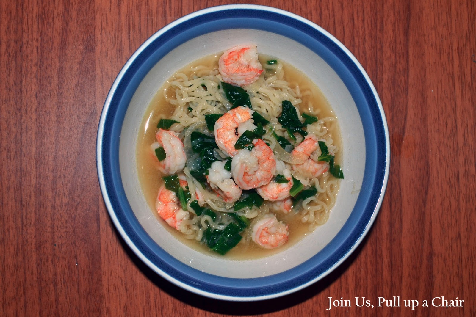 Add the chopped spinach and cook for 1 minute. Add the ramen noodles and cook for another minute. Finally add the shrimp and cook until the shrimp are opaque and the ramen is cooked. Taste for seasoning and add another tablespoon of soy sauce.