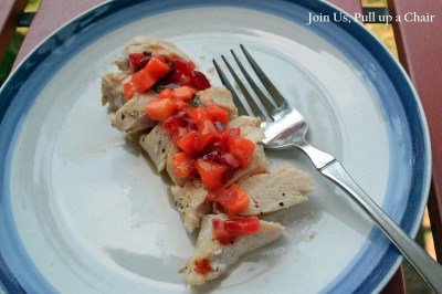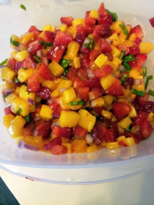 I love incorporating fruit into salad, something my husband isn’t too fond up but I’ll convert him soon. Fruit salsa is such a treat and there’s so many varieties – sweet, spicy…really anything you want. I decided on this strawberry mango salsa. It’s a sweet and spicy with the addition of red onion. We enjoyed it both with blue corn chips and also as a topping to grilled chicken.
