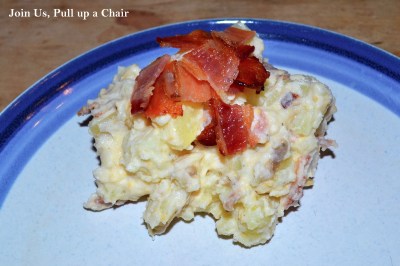 This salad tastes just like baked potato soup. I loved using Yukon Gold potatoes and I kept the skin on them so they kept all their nutrients and gave that real baked potato taste! The salad can be enjoyed warm or chilled. We ate it both ways and it was delicious!