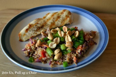 Each month, a theme is assigned and there’s pretty much free reign to make a salad that highlights the featured ingredient or salad type. This month’s theme was Asian inspired salads. There’s so many ways to follow this theme but I decided to go with a quinoa based salad that has a peanut dressing, lots of veggies and topped with green onions and peanuts. It was so good and it makes a lot…we were eating it for lunch and dinner for days. It can be either eaten at room temperature or cold and it was good both ways.