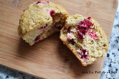In a large bowl, combine the flours, sugar, baking powder, baking soda and salt. Add in the cranberries an stir. In small bowl, combine the melted coconut oil, orange juice, egg and orange zest. Pour the wet mixture into the dry and combine just until moistened.