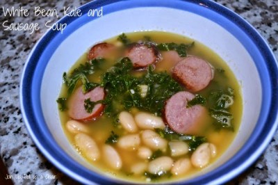 In a Dutch oven, heat one tablespoon of olive oil over medium heat and add the sausage. Brown both sides, approximately 5 to 7 minutes. Transfer the browned sausage to a paper towel lined plate. Add the remaining tablespoon of oil and cook the minced garlic for one minute. Pour in 4 cups of chicken stock into the pot and add in the kale, and garlic powder. Bring to a boil and then reduce heat to low. Cover and simmer for about 5 minutes.
