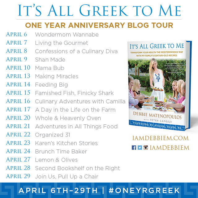 I’m excited to once again participate in a blog tour featuring Debbie Matenopoulos’ cookbook It’s All Greek to Me. It was another opportunity to pick an authentic recipe and I chose Dakos, otherwise known as Greek Brushetta. This salad is served on top of hard bread, not slices like I’ve had before. It’s simple and so delicious. Even my daughter had a couple of slices of bread. I can’t wait to make it again this summer when my garden is bursting with tomatoes. It’s best to use very ripe tomatoes, you want the juices to soak into the crusty bread.