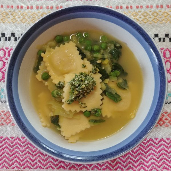 In a large pot, heat 1 1/2 tablespoons of olive oil over medium heat. Once warm, saute the leeks until softened. Add chicken stock and increase heat to medium-high. Bring to a boil and then reduce heat and simmer for 8 minutes. Add the pasta and allow to cook in the stock. You might need more stock if you pasta soaks up the liquid. Once the pasta is just about fully cooked, add in the peas and spinach. When the spinach has wilted, season with lemon juice, salt and pepper. Divide the soup between 4 bowls and top with a dollop of pesto. Stir to combine and enjoy!