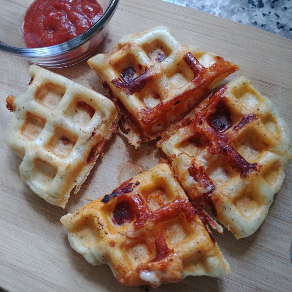Once the dough has doubled in size, divide the dough in half and then divide the balls in half again. Stretch the dough into a five inch round. Place a layer of sauce down, pepperoni and cheese. Layer with another piece of dough. Press the ends together and place on a greased waffle iron. Cook for approximately four minutes. Repeat with the remaining dough. Serve with extra pizza sauce for dipping. Makes four waffles.