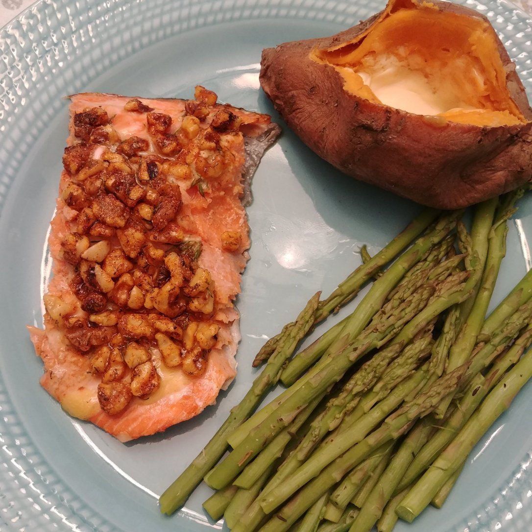 I found this recipe and it was delicious! The tangy of the Dijon mustard with fresh dill and chopped walnuts worked perfectly with salmon. I’ll definitely be making it again! I served with steamed asparagus and baked sweet potatoes. I had one piece left and placed it over a green salad with a red wine vinaigrette dressing and it was one of the best lunches I’ve had in a long time.