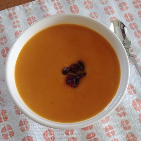 Carefully open the lid. Remove the sage leaves if you do not like them (I took half of mine out). Add in the coconut milk. Using an immersion blender, blend the soup until it is creamy and silky. Divide into bowls and top with any desired toppings. I sprinkled a few dried cranberries in my bowl, but it would be great with croutons, sunflower seeds or a drizzle of coconut milk.