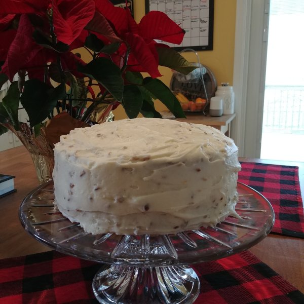 Frost between both layers and the sides and the top of the cake. If desired, serve with sugared cranberries or additional chopped pecans.