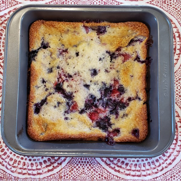 Remove the baking pan from the oven when the butter is melted. Swirl it around the pan to coat the sides and bottom. Pour the butter into the batter and whisk together. Pour the batter into the pan and evenly spread. Place the berries on top of the batter as evenly as possible. Leave a 1/2 inch edge around the sides – you’ll want the crispy edges.