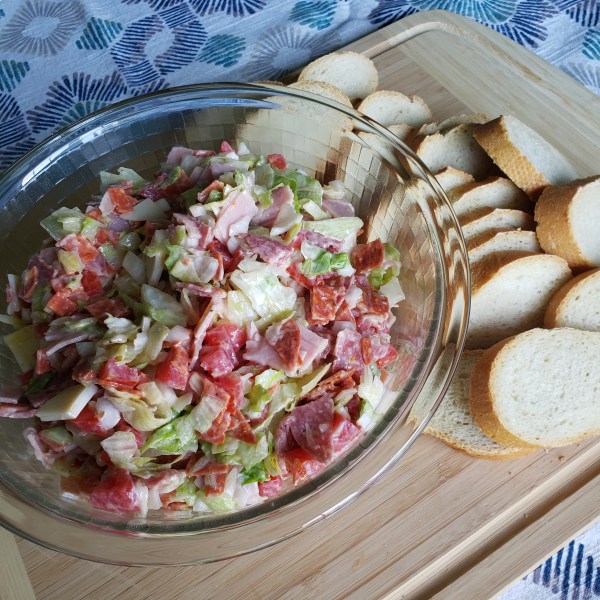 It’s basically all the insides of an Italian hoagie chopped up, mixed together with a dressing and served with sliced bread. I know this is going to be a staple in our house!