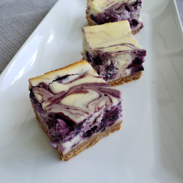 These cheesecake bars were delicious! The blueberry swirl breaks up the rich and creamy cheesecake.