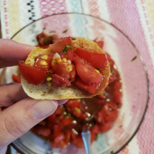 In a medium bowl, place the chopped tomatoes, basil and garlic cloves. Add the vinegar, olive oil and season with salt and pepper. Stir to combine. Cover and place in the refrigerator until you’re ready to serve. Toast the baguette and enjoy!