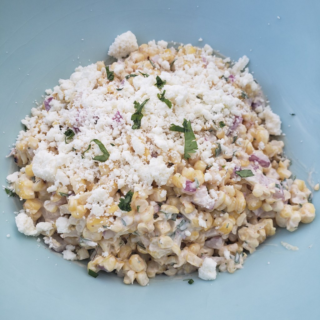 Summertime here in our house means fresh corn on the cob and we’ve been enjoying it for the last couple of weeks. My kids don’t like eating it off the cob so I was looking for something different to make with the last dozen I bought. I scoured Pinterest and found a recipe for elote corn salad.