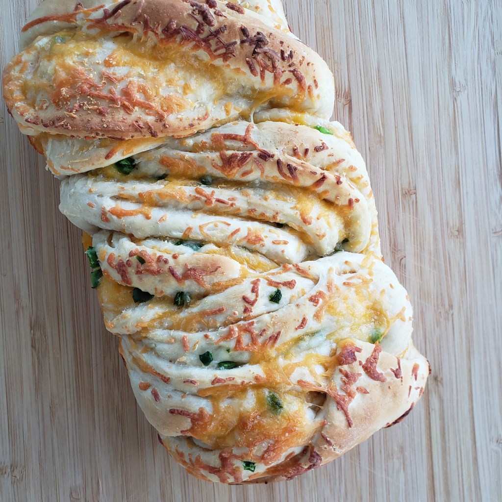 Pour the yeast mixture into the stand mixer bowl and add in the egg. Stir the mixture with a dough hook until combined. Slowly add in the remaining cup of flour and mix until the a bowl of dough forms. Transfer the dough to a lightly floured surface and knead for a a few minutes. Allow to rest for 5 to 10 minutes. Using a rolling pin, roll the dough out to a 10×14 rectangle. Sprinkle the garlic powder over the dough and then evenly spread the minced jalapeno and cheese. Starting at the long-end of the dough, tightly roll the dough. Using a knife, cut the roll of dough into two, leaving about an inch uncut at one end. Start braiding the dough with the cut side out. Carefully transfer the loaf to the prepared pan. Cover and allow to rise in a warm place for about an hour.